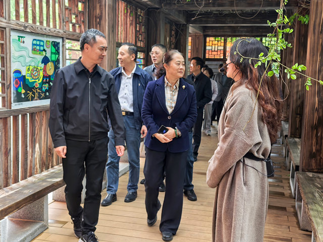 视察组一行先后参观学校画廊、画墙、画苑、德育主题楼道及艺术创作中心。在学生普法作品前,孙宇瑾主席驻足细看,频频点头,对孩子们用画笔表达对法律知识的理解、展现法治精神的做法表示高度赞赏。在创作中心内,视察组一行观看了学生在帆布包、瓷盘、团扇、明信片等媒介上以农民画为原型创作的各类衍生作品。这些作品形式多样、创意纷呈,充分展现学校在融合美育与普法教育、推动传统文化创新表达方面取得的扎实成效。